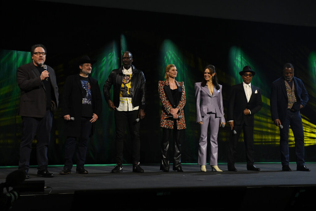 The focus then shifted to Star Wars: The Mandalorian as Kennedy invited the series’ executive producers Jon Favreau and Dave Filoni to the stage. The duo, along with fellow executive producer Rick Famuyiwa, were on hand for a discussion of the third season of the hit show, now streaming, exclusively on Disney+. Following a special video greeting from star Pedro Pascal, fans were treated to a clip from next week’s episode. Afterward, stars Giancarlo Esposito, Katee Sackhoff, Carl Weathers and Emily Swallow joined the stage and announced a special sneak-peek screening of the upcoming episode for those in attendance later that evening.